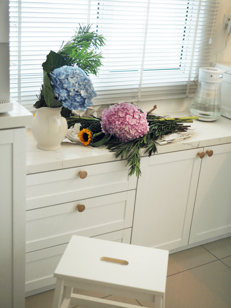 Kitchen is the heart of this home. This cozy kitchen was created for cooking, baking, floral arranging, and socializing. It was important to make this space functional and flexible so that the owner could utilize it for all the activities.
